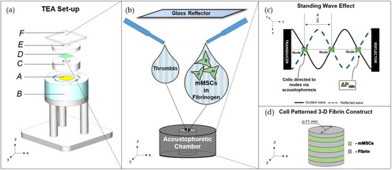 Tissue engineering acoustophoretic (TEA) set-up: (a) SOLIDWORKS software-designed drawing of the TEA set-up, displaying the key components: piezoelectric ceramic disk (A), 3-D-printed stand (B), coupling chamber (C), sealing film (D); acoustophoretic chamber (E) and glass reflector (F); (b) zoom-in into the acoustophoretic chamber; (c) principle of standing wave effect and acoustophoresis-directed cell patterning; (d) three-dimensional patterned fibrin cell construct.