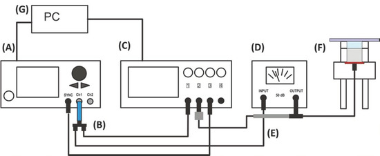 Schematic representation of the transmission voltage measurements in the TEA set-up: function generator (A), 15dB attenuator (B), oscilloscope (C), amplifier (D), oscilloscope probe (E), TEA set-up (F), and computer with software (G).