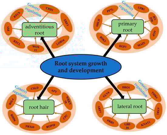 The primary root, which develops from the radicle, has a strong growth ability and can grow to a depth of 2–3 m. In a study of Arabidopsis, Jia et al. [] used genome-wide association analysis to identify genes associated with changes in primary root length. The authors identified BRASSINOSTEROID-SIGNALING KINASE 3 (BSK3) as the main gene effecting primary root length. In addition, the basic helix-loop-helix (bHLH) transcription factor UPBEAT1 (UPB1) regulates the balance between cell proliferation and differentiation by directly controlling peroxidase expression []. The differential localization of UPB1 in transcriptional and translational reporter gene lines of Arabidopsis suggests that deletion mutants of UPB1 lead to impaired growth of the primary root. The transcriptional regulator may also function as an intercellular signaling molecule and provide a direct transcriptional link between the distribution of reactive oxygen species (ROS) and the proliferation state of root apical cells []. In Arabidopsis, overexpression of HOOK-ASSOCIATED PROTEIN 3B (HAP3b) promotes elongation of the primary root. Root cells overexpressing HAP3b elongate faster than wild-type root cells, and HAP3b is specifically expressed in the apical region and promotes apical cell division and elongation [].