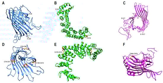 ApoB-100 subunit I domains structures and disulfide bonds. (A–C) Ribbon representation of subunit I domains. The N and C termini of each domain are colored in dark blue and red respectively and labeled with a residue number. Domain 1 (blue) is an incomplete β-barrel that extends from E28 residue to K320. Domain 2 (green) is arranged in two layers of α-helices (Q321-K616). Domain 3 (magenta) with two β-sheets on the right and left side and α-helices at the base creates a cavity in the center. (D–F) Ribbon representation of subunit I domains with disulfide bonds colored in yellow and cysteine residues colored in red with the ball and stick representation. Four disulfide bonds are located in domain 1 (D), two disulfide bonds in domain 2 (E), and one disulfide bond in domain 3 (F).