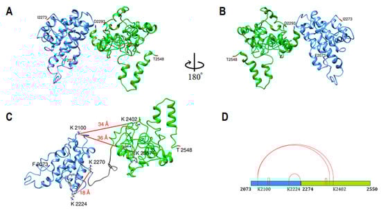 Human apoB-100 sequences (residues 2073–2273) and (residues 2274–2550) were applied to the HHpred server for homology detection [,,]. Templates with >95% sequence homology probability were selected to make multiple sequence alignments in PIR format (Table 2). Generated alignments were forwarded to MODELLER for structural prediction []. Apolipoprotein E, apolipoprotein A-I, and apolipophorin-III proteins were the main templates used for modeling. Both models were generated without experimental data intervention. The structures energy minimized for steric clashes using UCSF Chimera. Then subunit III was assembled by coupling the two domains using DEMO within the I-TASSER server []. Top templates used for domain assembly include (PDB ID/chain): 3s5hA, 6lykA, 4av3A, 6hqvA, 3s5mA, 1iduA, 4bedA, 4bedB, 3uw8A, and 2ya0A. There are five intra-subunit cross-links. Three cross-links were found within the 26 Å limit, but two cross-links between K2100-K2387 and K2100-K2402 exceeded the 26 Å limit, 36 Å, and 34 Å, respectively (Figure 4C) [,].