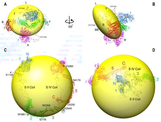 ApoB-100 architecture on lipoprotein particles. (A,B) Ribbon representation of apoB-100 on discoidal LDL (20 nm × 20 nm × 11 nm). The LDL particle is round from the top (Figure A) and oval shape from the side views (Figure B). Segments one (1) and two (2) are located on the top (T) of the disc. Subunit II coil (S II coil) is folded and positioned beneath subunit I. Segment three (3) on the front (F), segment four (4) on the bottom (BB) and right (R), and segment five (5) are located on the back (B). The protein does not cover the LDL particle’s left (L) side. (C,D) Ribbon representation of apoB-100 on spherical VLDL with 30 nm diameter. The structure encircles the lipid particle starting from the N-terminus (N) through segment four (4), then moves in the opposite direction (5) and crosses segment four and ends at the C-terminus (C). The red spherical representation of residue M1881 indicates the kink start point through M2358. Part of the protein from the N-terminus to I2179 illustrates apoB-48.