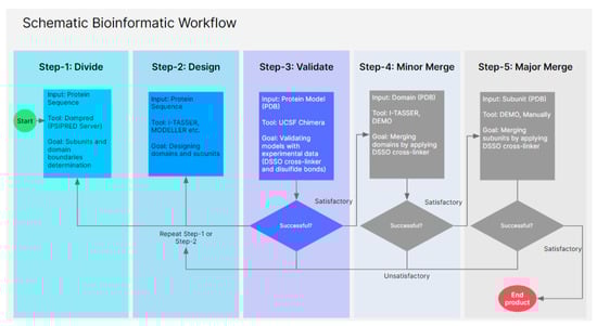 Human ApoB 100 structure is a heterogeneous molecule. Therefore, searching for templates and modeling for different parts varies based on the available structures in the database. The most successful protein structure prediction method relies on identifying homologous templates with known structures [,]. However, a database search does not provide homologous templates for all the regions. In this case, servers based on fold recognition by threading were used to generate models. Different software, such as the MPI Bioinformatic Toolkit, I-TASSER, DEMO, RoseTTAFold, and Phyre2 web portals, were used to develop accurate models [,,,,,,]. Homologous template database searches and selections are critical points for optimal alignment; hence, different parameters, including probability, E-value, and identity, have been modified for each sequence search to extend the target sequence coverage without reducing accuracy. Several models were generated from the sequence alignment with homologous templates. Then each model’s secondary and tertiary structures were examined and validated by experimental data, such as disulfide bonds and DSSO crosslinks. Finally, the high-ranked models for all domains were selected and assembled (Figure 10).