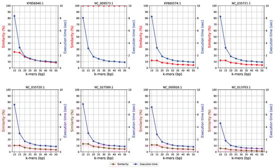 Figure 1 shows the results of similarity determination and execution time for the read alignment of each sequence from the dataset presented in Table 1. The similarity of read alignments of the eight query sequences was comparable for the k-mer values of 10 to 15; however, as the k-mer value decreased, the execution time inversely increased. Therefore, in the current study, the appropriate k-mer value was set to 15. For query sequence NC 009573.1, which was identical to the reference sequence, the similarity value was high regardless of the k-mer size. Therefore, when aligning two similar sequences, the alignment can be performed in a high-throughput manner by increasing the k-mer value. The query sequence was a reference sequence that had been split into 1, 2, 4, 6, 8, and 10 fragments, and randomly reassembled. The accuracy of read alignment of the reference sequence and the randomly rearranged query sequence was more than 99.99%. In the current study, the read alignment of the uncertain base “N” was not considered. Read alignment based on the reference sequence from which the uncertain base “N” was removed resulted in 100% accurate alignment. However, during reassembly after fragmentation, the k-mer-sized reads generated at sequence positions before splitting were not considered for read alignment.