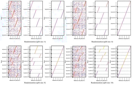 To determine the accuracy of the cPlot algorithm, the query sequence was divided and shuffled into fragments of arbitrary sizes, and matched with the original reference sequences. Figure 2 shows the results of short-read alignment of a reference sequence (NC_001137.3) and query sequences after shuffling; each x-axis is the base position of the reference sequence and the y-axis is the base position of the reassembled query sequence. The k-mer size for each split size was fixed at 15. The read alignment was accurate even after dividing into several files and reassembling in random order. Table 2 shows the sorted length and similarity for each query sequence with a split size of 8 in Figure 2. That is, when read alignment of the reassembled reference sequence was performed, the dreads were correctly aligned with 99.99% similarity. The aligned length of each query sequence was 2–3 bp shorter than the total length, because the reads generated in the section dividing the reference sequence were removed. A similarity of 99.99% or more was obtained even after excluding the read alignment for the segment to be divided. The “N” in the undefined reference sequence was not considered during read alignment.
