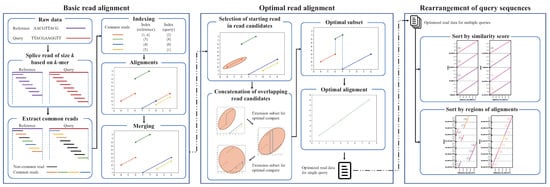 In the last step of analysis, when multiple query sequences are input, the order of the queries is rearranged based on similarity to the reference sequence. In this step, the analysis of one query sequence is the same as the result of “optimal read alignment”. Read alignment incorporates two functions. First, multiple query sequences are automatically sorted based on similarity to the reference sequence, from the most similar to the least similar sequence. Then, several query sequences mapped to the reference sequence region are automatically sorted into regions similar to the reference. Specifically, this function automatically sorts various scattered query sequences and rearranges them in a sequence similar to the reference sequence. Regardless of the input order, the query sequences are rearranged considering the appropriate region of the mapped sequence, with no need for a manual rearrangement and analysis of the query sequence when conducting an existing read alignment.
