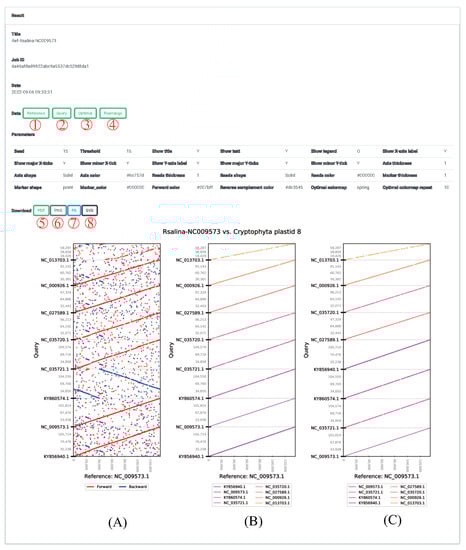 Figure 7C shows the rearranged optimal query sequence based on weight. In the optimal alignment result, weight is given to a portion of the reference sequence and the aligned sequence, and the query sequences with high similarity to the reference sequence are sorted in the bottom-up format, in descending order. In Figure 7A,B, the reference sequence is divided and ordered based on the order of the random input sequence, so that the query sequence similar to the reference sequence is arbitrarily scattered. Output file type provides an option to select the extension of the image file for the contig-plotting results. The output types provide .pdf, .ps, .png, and .svg extensions to store the contig-plotting results. By default, an image file with a .pdf extension is generated. The display option can be used to specify the properties of the resulting plot in the plotting option, such as the title, color for each query sequence, x-axis label, y-axis label, legend, point size, and line thickness. The user can generate various images by modifying the default options.