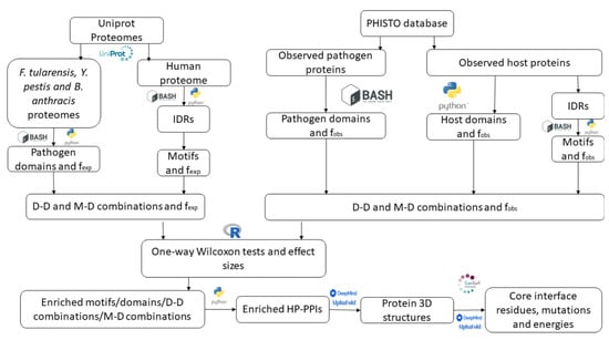 To find domains and motifs involved in host–pathogen PPIs, 9.333 PPIs between bacteria and human proteins were retrieved from the PHISTO database, 9.027 of which were unique interactions. These interactions are formed by 2.716 bacterial proteins and 3.737 human proteins. Here, InterProScan [] was used to identify domains from the protein sequences. Among these interactions, 2.539 unique domains were identified in human proteins and 1.898 in pathogen proteins. Then, the EBI-Alphafold database [] of protein structures was used to identify disordered regions in human proteins, and the RegEx definition of motifs in the ELM database [] was used to detect motifs. Intrinsically disordered regions (IDRs) were identified in 2.907 out of 3.519 human proteins and detected ELM motifs in 2.860 of these proteins. These results were used to build a pipeline and detect enriched domains, motifs, domain–domain interactions, and domain–motif interactions (Figure 1). In the following sections, enriched instances in the PHISTO database were used to investigate their relevance to the infection process. Additional details are provided in the Methods section.