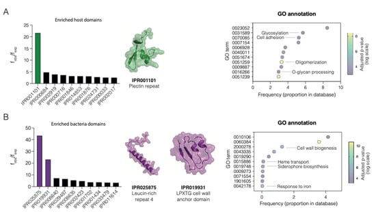 A total of 48 host and 69 pathogen domains (Supplementary Materials) were found to be enriched in the PHISTO database, being the plectin repeat domain (IPR001101) the most enriched one, with an observed frequency 21.69 times higher than expected (Figure 2A). The rest of the overrepresented human domains were observed from 2.49 to 4.77 times their expected frequencies. Plectin has a central role in the cell cytoskeleton and is involved in crosslinking of intermediate filaments []. It provides linkage between the keratin filaments inside the cell and the laminins in the extracellular matrix. Cytoskeleton remodeling is a central process in bacterial infections that allows internalization and dissemination of bacteria. For example, in Acinetobacter baumanii, several virulence factors (lipoproteins, OmpA, and Lon protease) were found to interact with cytoskeleton proteins, including plectin []. Enriched Gene Ontology (GO) terms for human proteins include cell adhesion and glycosylation, both relevant to pathogen adherence to the cell matrix (Figure 2A). Regarding the pathogen domains, a similar pattern was observed (Figure 2B). Two domains were highly enriched: IPR025875, a leucine-rich repeat, and IPR019931, the LPXTG cell wall anchor domain. Other domains showed enrichment frequencies from 3 to 7 times higher than expected. Leucine-rich repeats are found in bacterial surface proteins and are associated with PPIs, such as internalins in Listeria monocytogenes, used to invade mammalian cells via cadherins transmembrane proteins []. LPXTG cell wall anchor domains are surface proteins commonly found in Gram-positive bacteria, including pilus, fimbria, and adhesins []. A GO enrichment analysis of the domains retrieved shows relevant functions related to bacterial infection, such as cell wall biogenesis and siderophore biosynthesis (Figure 2B).