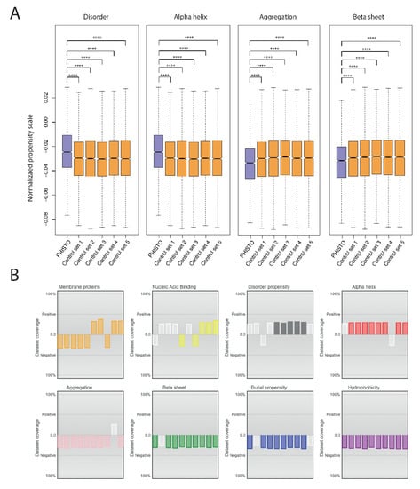 Physicochemical and structural properties of human proteins participating in host–pathogen interactions. (A) Boxplot representation of major properties for human proteins in PPIs compared to five groups of human proteins selected by random picking from the human proteome. (B) Overall representation of all scales used in CleverMachine for evaluating features in proteins. For a list of all properties evaluated, see []. Statistical comparisons were made using the Mann-Whitney U-test. **** p ≤ 0.0001.