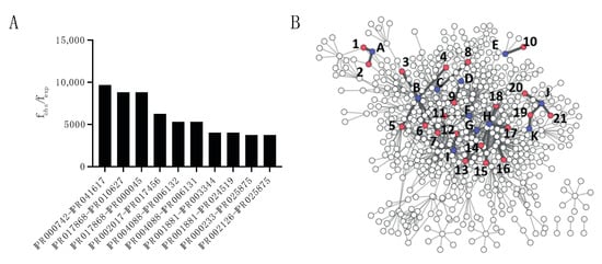 As many PPIs are driven by domain interactions, certain domain associations might be privileged in host–pathogen PPIs. To do this, the frequency of all occurring domain–domain (DD) associations were calculated and compared with the expected frequency if associations would occur at random. The 10 most enriched DD associations are depicted in Figure 4A. Most of the observed 149 enriched domain associations occur in one or two different interactions while 21 of them were counted in three or more different interactions. A network of all DD associations is displayed in Figure 5B, with the 21 most frequent interactions highlighted and listed in Table 1 and Supplementary Materials.