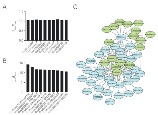 Analysis of enriched motifs and domain–motif associations. (A) Bar plot representation of the 10 most enriched motifs and (B) domain-motif combinations. (C) Network representation of domain–motif associations. Domains are colored in blue and motifs in green.
