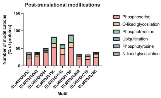 Motifs are susceptible to modulation by post-translational modifications, which can notably modify the interactions. Hence, we investigated whether the motifs present in DM associations could be modified. We used the MusiteDeep [] tool that uses deep learning to predict post-translational modifications in proteins. As expected, the motifs can be heavily modified (Figure 6), particularly motifs ELME000136 (Group IV WW substrates), ELME000155 (SH3-binding motif), and ELME000159 (MAPK phosphorylation site). These motifs are also susceptible to O-linked glycosylation, particularly ELME000155.