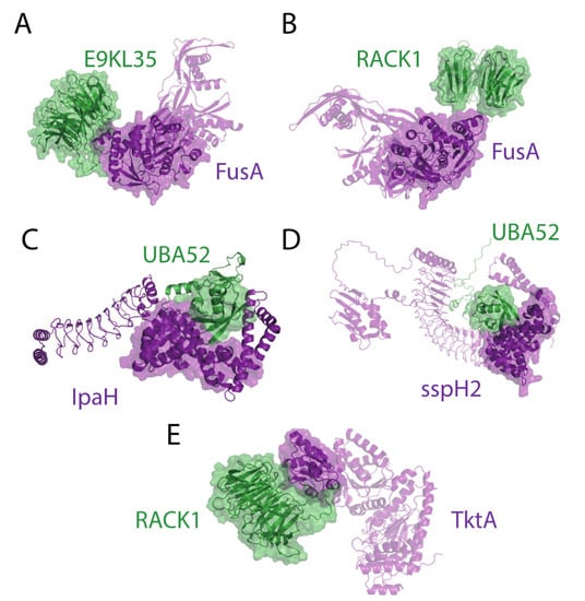 From the 21 enriched DD and 75 DM interactions, representative complexes were modeled using AlphaFold Multimer [,]. We restricted the cases where the total length of the proteins of the interaction was lower than 1.500 residues. Proteins with low confidence regions (pLDDT score < 0.5) above 10% were filtered out. Using these constraints, 15 representative DD and 27 DM complexes were predicted. From 15 DD complexes, 5 of them had pTM scores above 0.5: fusA-E9KL35 (pTM score = 0.75), fusA-RACK1 (pTM score = 0.65), sspH2-UBA52 (pTM score = 0.62), ipaH9.8-UBA52 (pTM score = 0.58), tktA-RACK1 (pTM score = 0.57). In all cases, the associated domains were found in close proximity according to Alphafold predictions, suggesting that our pipeline correctly identifies DD associations with high confidence (Figure 7).