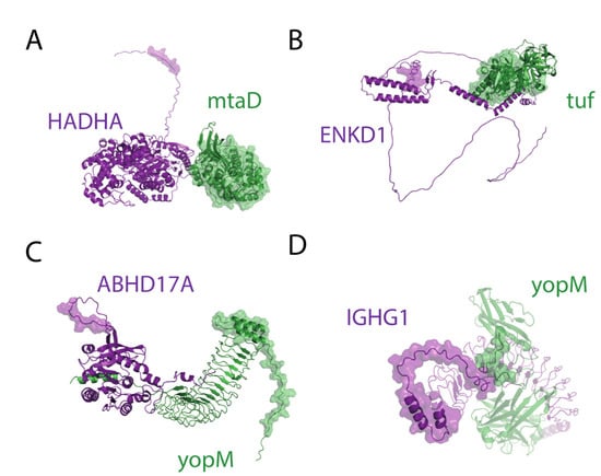 Domain–motif interactions predicted by Alphafold Multimer. (A) HADHA-mtaD; (B) ENKD1-tuf; (C) ABHD17A-yopM; (D) IGHG1-yopM.