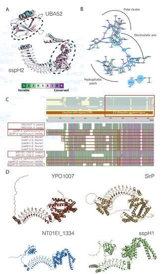Analysis of complexes between IpaH and sspH2 with ubiquitin UBA52. (A) Structure of UBA52 and sspH2 showing the degree of sequence conservation. The conservation scale is displayed at the bottom of the figure. (B) Residue contact network between UBA52 and sspH2 showing several contact signatures. (C) Blast search results using the ubiquitin-protein ligase domain as the query sequence. Newly identified domains are highlighted by brown boxes. (D) Predicted structures of selected proteins using Alphafold [].