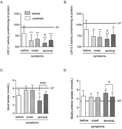 Effects of ALS disease progression and swim training on skeletal muscle LDH 2.1 and LDH 0.3 activities and skeletal muscle and blood LA concentration. LDH 2.1 (A) and LDH 0.3 (B) activities were measured in the tibialis anterior muscle of mice; LA concentration was measured in the blood (C) and the tibialis anterior muscle of mice (D). There were significant differences between the groups: * p < 0.05, ** p < 0.01 and *** p < 0.001 vs. WT group of mice, a p < 0.05 and b p < 0.01 vs. BEFORE group, C p < 0.001 vs. ONSET group (Tukey’s post-hoc test), # p < 0.05 and ### p < 0.001 between indicated group (Student’s t-test). The data are presented as the means ± SEM (n = 7 in each group).