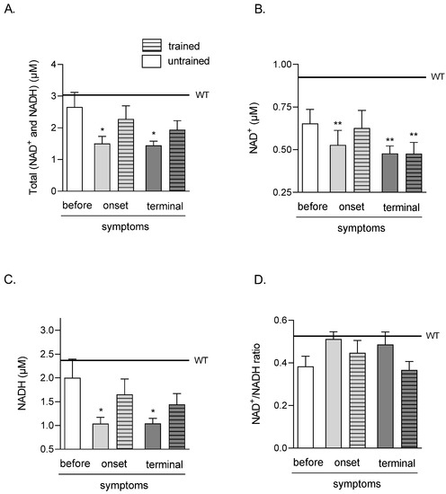 The total amounts of TA muscle nicotinamide adenine dinucleotides (NAD+ and NADH) were significantly lower in both ONSET and TERMINAL untrained groups (1.51 ± 0.22 and 1.45 ± 0.13 μM, respectively) than that in the WT group of mice (3.04 ± 0.31 μM). Swim training did not significantly increase the analyzed coenzyme amounts in both groups (2.28 ± 0.42 and 1.94 ± 0.28 μM in ONSET and TERMINAL trained groups, respectively) (Figure 2A).