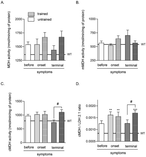 The values of the cMDH/LDH 2.1 ratio were significantly higher in both (trained and untrained) ONSET and TERMINAL trained groups of mice (0.0016 ± 0.00013, 0.0015 ± 0.00018, and 0.0017 ± 0.0001 in ONSET untrained, ONSET trained, and TERMINAL trained groups of mice, respectively) than that in the WT mice group of mice (0.001 ± 0.00004). Further, the cMDH/LDH 2.1 ratio was significantly lower in the TERMINAL untrained group (0.0013 ± 0.00014) than that in the TERMINAL trained group (Figure 3D).
