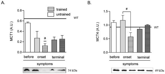 There were no changes in MCT4 protein levels in all ALS groups as compared with the WT group of mice. Further, swim training at the ONSET stage of the disease (0.58 ± 0.15 A.U.) induced a lowering of MCT4 protein level as compared with the ONSET untrained group (1.18 ± 0.18 A.U.). There was also a tendency of an increased MCT4 protein level at the terminal stage of the disease from 0.85 ± 0.07 A.U. in the TERMINAL untrained to 1.00 ± 0.01 A.U. in the TERMINAL trained groups of mice (p = 0.088) (Figure 4B).