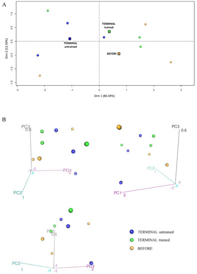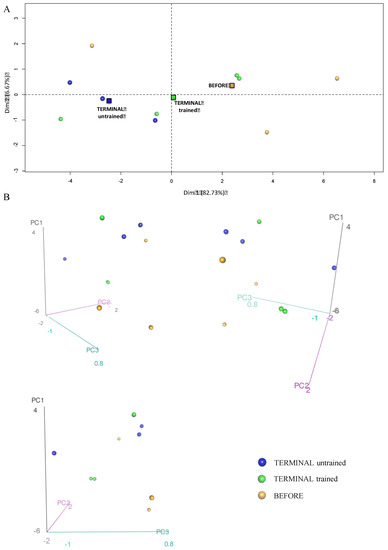 Principal component analysis showing differences in the glycolysis proteome profiles of the BEFORE, TERMINAL untrained, and TERMINAL trained groups: (A) The 2D graph of variables PC1 and PC2 created using a PCA based on the level of 16 identified proteins involved in glycolysis measured in TA muscle of ALS mice; (B) the 3D graphs of variables PC1, PC2, and PC3 created using a PCA based on the level of 16 identified proteins involved in glycolysis measured in the TA muscle of ALS mice. 3D individual graphs show the view from a different angle on the same distribution of events in the 3D space. The data are presented as the means (squares) and individual results (dots) (n = 3 in each group).