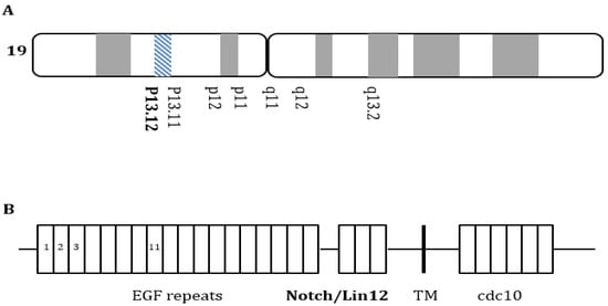 NOTCH3 gene mutations. (A) NOTCH3 gene located on chromosome 19p13.12; (B) NOTCH3 gene mutations are located within the extracellular domain that encodes the epidermal growth factor-like repeats, three Lin-NOTCH repeats, and one transmembrane region.