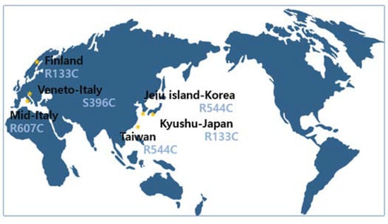 “Founder effect” reported in many countries: Taiwan (R544C) [], Jeju island in Korea (R544C) [,], Finland (R133C) [], the Kyushu area in Japan (R133C) [], mid-Italy (R607C) [] and the Veneto region in Italy (S396C) []. * This figure was modified from [].