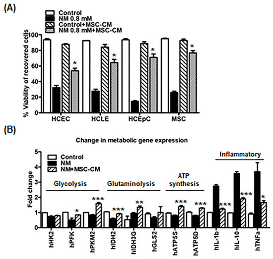 2.2. MSC-CM Rescues Immediate Cytotoxic Effects and Enhances Wound Healing in Corneal Epithelial Cells Exposed to NM