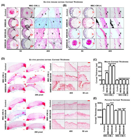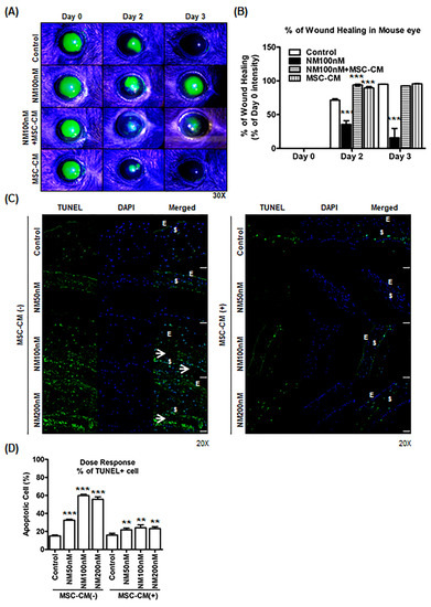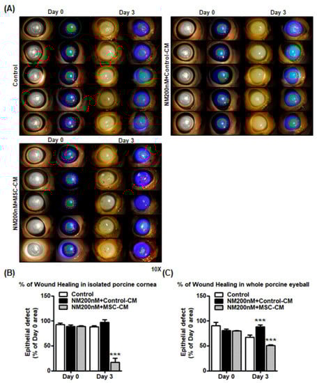 2.5. Effect of MSC-CM on Murine and Porcine Corneal Wound Healing after NM Injury