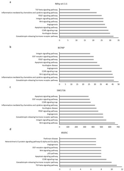 After analyzing the data obtained by meRIP-seq in the individual cell lines, the m6A-enriched mRNAs in each cell line were subjected to ontology-based pathway analysis in order to outline which pathways were mostly involved in m6A addition in each cell line. We selected pathways in which at least two components were enriched in the selected model (Figure 2). With these settings, five pathways are common for all four cell lines (Wnt, CCKR, gonadotropin-releasing hormone receptor (GNRH) signaling, angiogenesis, and apoptosis). This suggests that m6A modification of mRNAs involved in these processes could play a key and not coincidental role in their modulation. Interestingly, though Nthy-ori-3.1 and 8505C cells are close in the PCA, only the TGF-beta signaling pathway is unique and common. Seven pathways are shared between the two anaplastic cell lines.