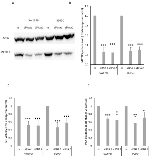 In order to test cell viability, we applied the methylthiazolyldiphenyl-tetrazolium bromide (MTT) assay. SW1736 and 8505C cells (3000 cells/well) were plated onto 96-well plates in 200 μL medium/well and were allowed to attach to the plate for 24 h (t0). Plates were then treated either with negative control (nc) or with two METTL3-specific siRNAs (siRNA 1 and siRNA 2) for 72 hours. Then, 4 mg/mL MTT (Sigma-Aldrich) was added to the cell medium, and cells were cultivated for another 4 hours in the incubator. The supernatant was removed, 100 μL/well of DMSO (Sigma-Aldrich) was added, and the absorbance at 570 nM was measured. All experiments were run sixfold and cell viability was expressed as a fold change compared to control. To confirm cell viability data, 6 × 106 cells were plated and left to grow for 24 hours, after which they were treated with negative control or METTL3-specific siRNAs. After 72 hours of treatment, cells were detached, stained with trypan blue, and counted under a light microscope.