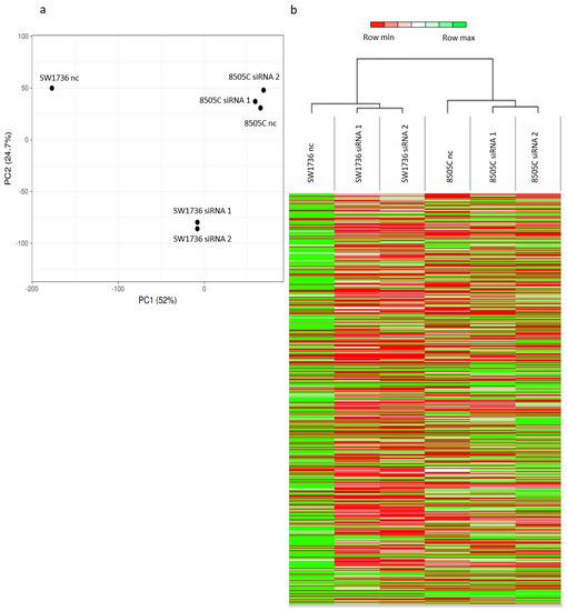 Gene expression analysis after METTL3 silencing in ATC cells. (a) Principal component analysis (PCA) results. Each point represents an RNA-seq sample. Samples with similar gene expression profiles are clustered together. (b) Heat maps showing the hierarchical clustering of RNAs in untreated cells (SW1736 nc/8505C nc) and in METTL3 siRNA-treated ones (SW1736 siRNA 1/8505C siRNA 1 and SW1736 siRNA 2/8505C siRNA 2) and 8505C. Results are shown as fold change (log 2).