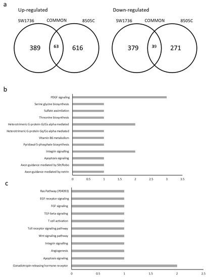 Merging data from siRNAs 1 and 2 in each cell lines, 389 targets were commonly up-regulated and 379 targets were down-regulated in SW1736, while 616 targets were commonly up-regulated and 271 were down-regulated in 8505C. The mean between the two siRNAs was calculated. Only mRNAs with a log 2 fold change less than −2.5 or greater than 2.5 were considered. As for commonly deregulated genes in the two ATC cell lines, 63 up-regulated and 39 down-regulated RNAs were obtained (Figure 5a) The RNAs commonly up- or down-regulated in ATC cell lines were, then, subjected to ontology-based pathway analysis. With regard to up-regulated genes, the pathways most involved seem to be: integrin signaling; heterotrimeric G-protein signaling pathway, Gi alpha and Gs alpha mediated; and PDGF signaling pathway (Figure 5b). On the other hand, analyzing the commonly down-regulated genes, the only pathway with more than one gene involved was the gonadotropin-releasing hormone receptor (GRHR) pathway (Figure 5c).