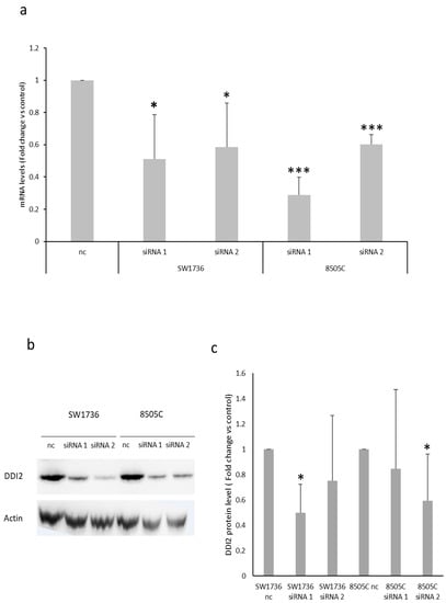 Assuming a direct relationship between addition of the m6A modification to the mRNA and the expression of that particular gene, we focused on the only gene that was found to be down-regulated as a result of METTL3 silencing. The expression levels of DDI2 were reassessed by real-time PCR, confirming the significant reduction in DDI2 after treatment with both siRNAs and in both ATC cell lines (Figure 6a). To further investigate the extent of the effects of METTL3 silencing on DDI2, its protein expression levels were assessed. Figure 6 (panels b–c) shows that DDI2 protein levels are also significantly reduced for at least one siRNA in both cell lines. Indeed, this represents a strong indication of the fact that the expression of DDI2 is finely regulated by the addition of m6A to its mRNA sequence.