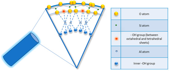 - Guimaraes, L.; Enyashin, A.N.; Seifert, G.; Duarte, H.A. Structural, electronic, and mechanical properties of single-walled halloysite nanotube models. J. Chem. Phys. 2010, 114, 11358–11363. [Google Scholar] [CrossRef]