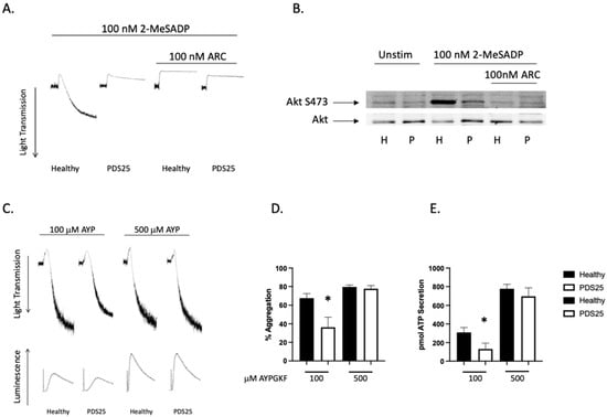 2-MeSADP-mediated aggregation is interrupted in platelets from PDS25. (A) Representative tracings showing aggregation of platelets from PDS25 and healthy control donors that were stimulated with 100 nM 2-MeSADP following pretreatment of 100 nM AR-C69931MX or not and monitored for 3 min to observe aggregation. (B) Western blot showing Akt phosphorylation in platelets from PDS25 or a healthy control following stimulation with 2-MeSADP. Total Akt was used as a loading control. (C) Representative tracings showing aggregation and secretion of platelets from a healthy control donor and PDS25 stimulated with the indicated concentration of AYPGKF. (D) Quantitation of aggregation of platelets from healthy control donors and PDS25 stimulated with the indicated concentration of AYPGKF. (E) Quantitation of ATP secretion from platelets stimulated with the indicated concentration of AYPGKF. * p < 0.05 vs. healthy control, n = 5.