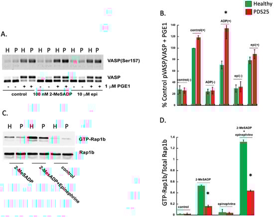 VASP is phosphorylated when cAMP is elevated via protein kinase A, and dephosphorylated when cAMP is squelched by Gi-mediated signaling []. Given the observed defect in platelets isolated from PDS25, we evaluated VASP phosphorylation following stimulation with either 2-MeSADP or epinephrine in platelets from PDS25 and a control donor. Platelets were treated with PGE1 to raise cAMP production and thus raise phosphorylation of VASP. While subsequent treatment of control platelets with 2-MeSADP reduced phosphorylation of VASP, VASP phosphorylation in platelets from PDS25 remained elevated (Figure 2A,B). Contrarily, there was no difference in VASP phosphorylation between control and PDS25 platelets when epinephrine was used as an agonist suggesting that cAMP reduction downstream of Gz is intact. Consistently, we also observed inhibited GTP-Rap1b formation in platelets from PDS25 stimulated with 2-MeSADP compared to similarly treated control platelets (Figure 2C,D). The combination of 2-MeSADP and epinephrine enhanced the GTP-Rap1b signal, but it did not equal that of control platelets. These data suggest that cAMP and subsequent signaling downstream of P2Y12 is altered in platelets from PDS25 but is intact downstream of the epinephrine receptor.
