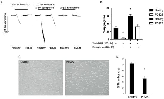 Gz-mediated aggregation is intact in platelets from PDS25, while thrombus formation on collagen is inhibited in whole blood from PDS25. (A) Representative aggregation tracings of platelets isolated from PDS25 or healthy controls stimulated with 100 nM 2-MeSADP, 10 μM epinephrine, or both. (B) Quantitation of aggregation as represented in panel A. * p < 0.05 vs. healthy control stimulated with 100 nM 2-MeSADP, n = 4. (C) Representative images of thrombus formation following whole blood (from PDS25 or healthy controls) flow over a collagen-coated surface. (D) Quantitation of thrombus area resulting from whole blood flow over collagen. * p < 0.05 vs. healthy control, n = 5.