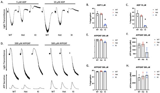 D127N KI mouse platelets have a significantly inhibited response to ADP. (A) Representative tracings showing aggregation in response to either 5 or 10 μM ADP of platelets isolated from WT, Het, or KI mice. (B,C) Quantitiation of platelet aggregation in response to 5 or 10 μM ADP. (D) Representative aggregation and secretion tracings of platelets isolated from WT, Het, and KI mice stimulated with 200 or 500 μM AYPGKF. (E,F) Quantitation of aggregation (E) and secretion (F) from WT, Het, and KI platelets stimulated with 200 μM AYPGKF. (G,H) Quantitation of aggregation (G) and secretion (H) from WT, Het, and KI platelets stimulated with 500 μM AYPGKF.