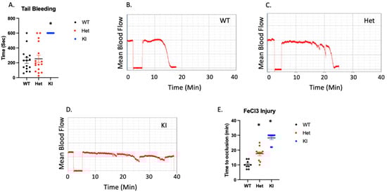 Mouse tail bleeding was conducted as previously described []. Mice aged 4–6 weeks were anesthetized prior to amputation of the distal 3 mm of the tail. The tail was then immersed in 37 °C saline and bleeding was monitored. If bleeding continued for greater than 600 s, then bleeding was halted manually by applying pressure.