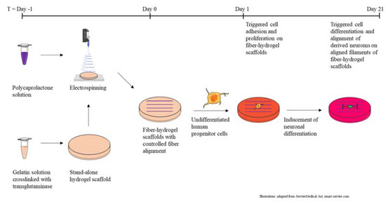 The production of fiber–hydrogel scaffolds offers great potential for the fabrication of scaffolds for tissue engineering and regenerative medicine, combining the advantages of hydrogels (e.g., stiffness) with electrospun fibers replicating a native extracellular matrix and introducing topographical cues.