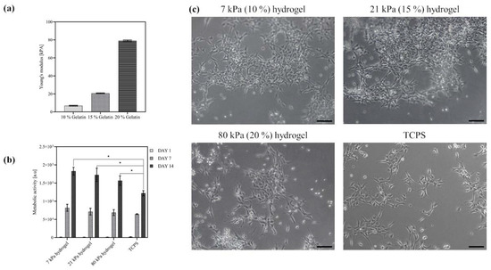 Structural support of culture, viability and differentiation of human neural progenitor cell lines is provided by customized hydrogels. A key feature of these gels is to match the Young’s Modulus of the cells of the central nervous system, which is in the typical stiffness range 20 to 100 kPa. To this purpose, aiming to gradually increase the elastic moduli, three hydrogels with different concentrations of gelatin (10%, 15%, 20% w/w), were produced. For crosslinking, transglutaminase with a concentration of 50 mg/mL was added to the gelatin solution and incubated for 12 h at 37 °C. In this process, acyl transfer of a lysine bond leads to intra- and intermolecular crosslinking of proteins through formation of an isopeptide bond. The average sample thickness was 2.0 mm. As shown in Figure 2a, at a temperature of 37 °C the stiffness of all hydrogels (6.8 kPa ± 0.5; 20.7 kPa ± 0.4; 79.0 kPa ± 0.8) was within the desired range (20–100 kPa) and increases with increasing gelatin concentration. In comparison to this, the elastic modulus of a standard tissue-culture polystyrene flask is around 3.5 GPa [36].