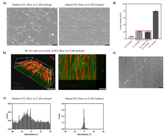 Scaffolds of electrospun PCL fibers on gelatin hydrogels. (a) Optical micrographs of random and aligned electrospun PCL fibers on 21 kPa hydrogels, scale bar = 100; (b) 3D volume view and cross section of confocal micrographs of PCL fibers (in red) on 21 kPa hydrogels (in green), scale bar = 200 µm; (c) Histograms with distribution of directionality µm of PCL fibers on 21 kPA hydrogels (left: random with number of fibers N = 200, right: aligned with number of fibers N = 500); (d) Elastic modulus [kPA] of transglutaminase-crosslinked gelatin hydrogels, highlighted with red box 15% gelatin with and without PCL fibers at 37 °C, number of hydrogels N = 9; (e) PCL fibers on 21 kPa gelatin hydrogel after 28 days at 37 °C/5% CO2 in cell culture medium, scale bar 100 µm.