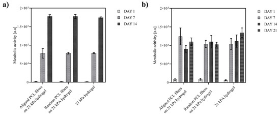 Neural progenitor cells and committed neurons on PCL-gelatin scaffolds. Cell viability (determined by Alamar Blue assay) of (a) ReN VM cells proliferated for 14 days and (b) committed neurons for 21 days on hydrogels and hybrid (aligned or randomly distributed) fibers on hydrogel scaffolds; number of hydrogels N = 9.