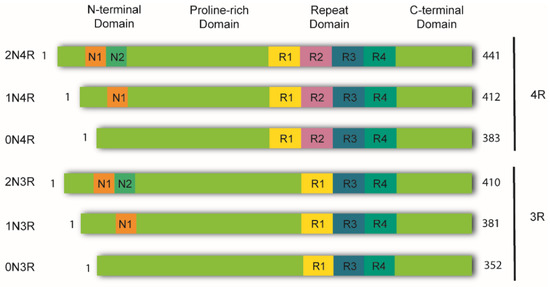 Schematic representation of tau isoforms. In the adult human brain, tau is found as six major isoforms (352-441 amino acids) resulting from alternative mRNA splicing. The N-terminal domain consists of either 0, 1, or 2 inserts encoded by exons 2 and 3 (0N, 1N, or 2N). The proline-rich domain is followed by the repeat domain (RD) also known as the microtubule binding domain (MTBR). Here, inclusion of exon 10 produces tau isoforms with four repeats (4R), whereas its exclusion produces isoforms with three repeats (3R). The RD is followed by the C-terminal domain.