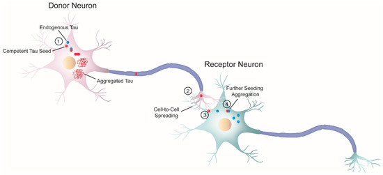 Both seeding and trans-cellular spreading of proteopathic tau seeds have been proposed as the pathological mechanism to explain the stereotyped progression of neurodegenerative tauopathies. Therefore, since tau is an intracellular protein, cell-to-cell spreading implies, in a broad sense, a four-step process (Figure 2): (1) one cell harboring intracellular tau aggregates (termed donor neuron), (2) release of competent tau seeds from the donor cell into the extracellular space, (3) internalization by a neighboring healthy cell (termed receptor neuron or glia), and (4) once inside, recruitment of their endogenous counterparts initiating further seeding.