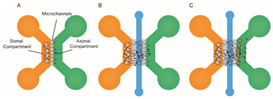 Neurons are post-mitotic cells with highly specialized morphology, which makes them greatly different from mammalian cell lines. Therefore, not only cellular pathways, but also the expression of specific proteins may differ from those in cell lines. Regarding tauopathies, this is illustrated by the fact that tau is mainly expressed by neurons (see above), as their function is to regulate MT dynamics. Thus, under physiological conditions, tau is localized in the axons. By contrast, under pathological conditions, it can be detected in the perikaryon and distal dendrites. Since most cell lines do not recreate neuronal morphology, these pathological events cannot be reproduced, thereby questioning the relevance of some published findings. Nevertheless, acknowledging such limitations has contributed to developing experimental approaches based on rodent neural primary cell cultures [114]. For instance, researchers have developed viral vectors to easily infect primary neurons to induce the overexpression of wild-type or mutated forms of tau. In addition, the introduction of microfluidic devices to experimental designs has helped characterize tau cell-to-cell spreading in primary neurons (e.g., see [115]). Briefly, in this context, the most commonly used microfluidic platforms include two or more chambers fluidically isolated but interconnected by microchannels [116,117], as illustrated in Figure 3. This design allows fluidic isolation of the neuronal soma and dendrites from axons. Therefore, researchers can independently treat, tune, and monitor the different chambers. Additionally, it is possible to co-culture neural populations in isolation within the distinct compartments and recreate neural connections, which can help investigate tau spreading between synaptically connected neurons [118].