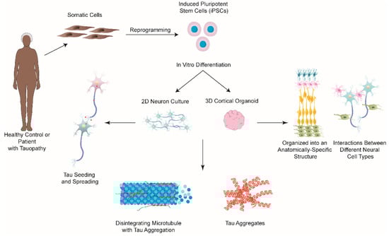 iPSCs-based 2D and 3D approaches for modelling tauopathies in vitro. Somatic cells, such as fibroblasts, can be taken from patients with either a tauopathy or healthy controls, and be reprogrammed to iPSCs, which can subsequently be differentiated into various types of neurons. Both 2D and 3D approaches have been studied to model different types of tauopathies. Studies utilizing these two models have successfully shown the formation of tau aggregates along with neurodegeneration. 2D neuron cultures have also been used to examine the mechanisms behind tau seeding and spreading. However, 2D cultures lack the intricate microenvironment and structural arrangement of the human brain. 3D brain organoids are comprised of a variety of different neuronal cell types, including neurons, neural progenitors, oligodendrocytes, and astrocytes, which organize into an anatomically-specific structure that closely mimics that of the developing human brain. This model allows for examining the interactions between different neuronal cell types, which better models the processes that occur in vivo compared to 2D models. The continued improvement of these iPSC-based technologies will contribute to a better understanding of the pathological mechanisms involved in tauopathies and will hopefully lead to the development and discovery of effective treatments against them.