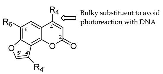As previously described, a hindered substituent at position 4 impairs DNA intercalation, thus preventing the unwanted photoreaction of the lactone or furan double bond of the furocoumarin scaffold with the nucleic acid [11,13]. For this reason, new analogs with cyclopropyl and aryl substituents at position 4 were designed (Figure 3, A series), in addition to the ethyl, propyl, and isopropyl derivatives already reported [11]. To also investigate the role of steric hindrance at position 6, we designed a further series of analogs with aryl substituents at this position (Figure 3, B series). Finally, derivatives with steric hindrances at both positions 4 and 6 were also considered (Figure 3, C series). In all cases, a 4′-methyl group or no substituent was inserted in the furan ring.
