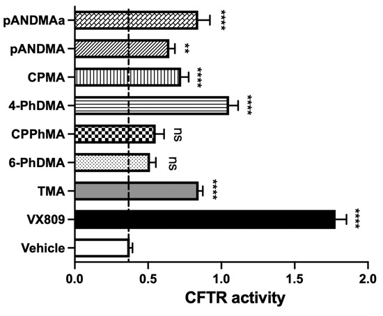 At the time of the assay, the correction of the F508del-CFTR function was evaluated in single-cell analysis by measuring the decrease in YFP fluorescence after the concomitant addition of extracellular iodide and the activating cocktail (20 μM forskolin and 5 μM VX770), in the presence or absence of the 10 μM CFTR inhibitor, CFTRinh-172. Figure 4 shows the activity of the TMA analogs compared to VX809 and TMA. Analogs not represented in the figure were less active than the vehicle. At least two derivatives show CFTR activity similar to that of the parent TMA.